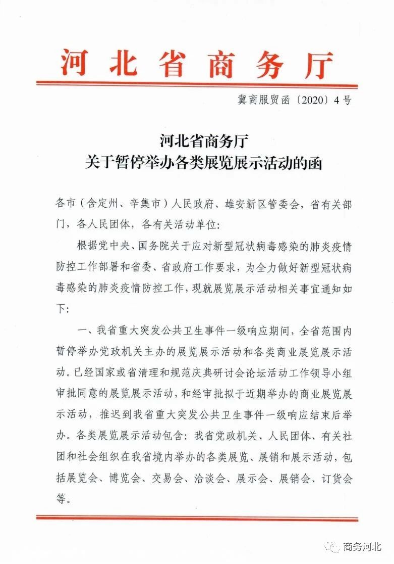 一、我省重大突發(fā)公共衛(wèi)生事件一級響應(yīng)期間,全省范圍內(nèi)暫停舉辦黨政機關(guān)主辦的展覽展示活動和各類商業(yè)展覽展示活動。已經(jīng)國家或省清理和規(guī)范慶典研討會論壇活動工作領(lǐng)導(dǎo)小組審批同意的展覽展示活動,和經(jīng)審批擬于近期舉辦的商業(yè)展覽展示活動,推遲到我省重大突發(fā)公共衛(wèi)生事件一級響應(yīng)結(jié)束后舉辦。各類展覽展示活動包含:我省黨政機關(guān)、人民團體、有關(guān)社團和社會組織在我省境內(nèi)舉辦的各類展覽、展銷和展示活動,包括展覽會、博覽會、交易會、洽談會、展示會、展銷會、訂貨會等。