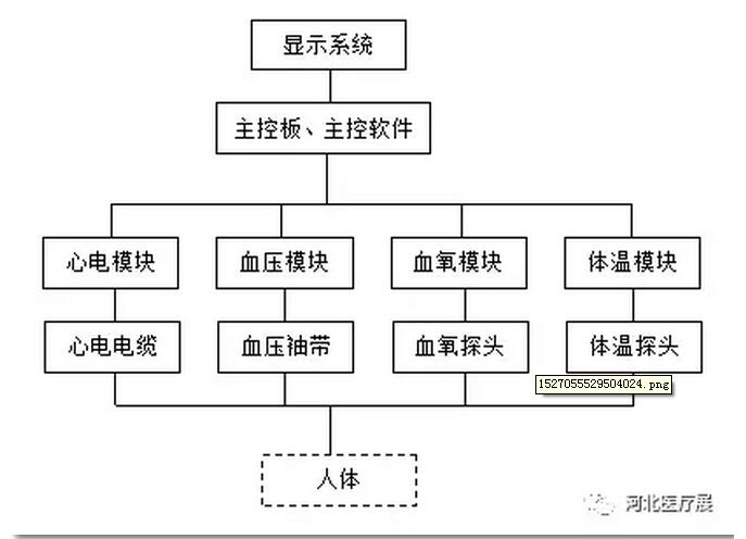 本儀器由六大部分組成:顯示系統(tǒng)、主板、心電模塊、血壓模塊、血氧模塊、體溫模塊。如下圖所示。