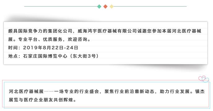 河北石家莊醫(yī)療展優(yōu)秀展商|品質(zhì)卓越 暢銷國外 威海鴻宇醫(yī)療器械有限公司于8月22日亮相鎮(zhèn)杰·河北秋季醫(yī)博會